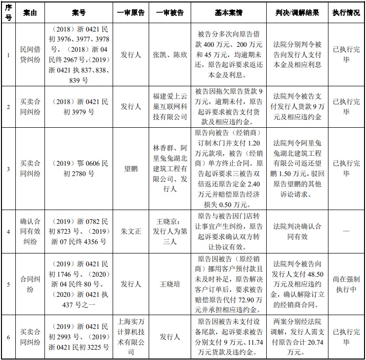 招股书显示,梦天家居共存在6项诉讼事项,其中两项公司为被告,一项公司为第三人。其中,案号为(2018)浙0421民初3976、3977、3978号,(2018)浙04民终2967号,(2019)浙0421执837、838、839号的民间借贷纠纷显示,梦天家居为一审原告,一审被告为张凯、陈欣。张凯、陈欣分多次向梦天家居借款400万元、200万元和45万元,均逾期未还,梦天家居起诉要求返还本金及利息。法院分别判令张凯、陈欣向梦天家居支付本金及相应利息,已执行完毕。
