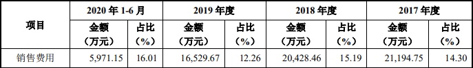 2017年至2020年1-6月,梦天家居销售费用分别为2.12亿元、2.04亿元、1.65亿元、5971.15万元,占营业收入比例分别为14.30%、15.19%、12.26%、16.01%。