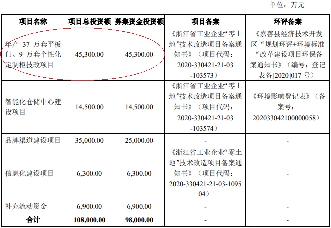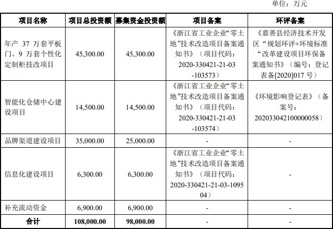 1.年产37万套平板门、9万套个性化定制柜技改项目,项目总投资额4.53亿元,募集资金投资额4.53亿元;2.智能化仓储中心建设项目,项目总投资额1.45亿元,募集资金投资额1.45亿元;3.品牌渠道建设项目,项目总投资额3.50亿元,募集资金投资额2.50亿元;4.信息化建设项目,项目总投资额6300.00万元,募集资金投资额6300.00万元;5.补充流动资金,项目总投资额6900.00万元,募集资金投资额6900.00万元。
