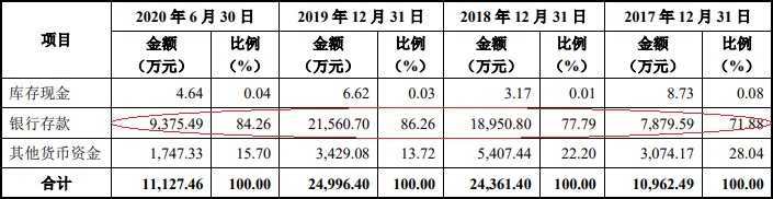 2017年至2020年1-6月,梦天家居货币资金中银行存款分别为7879.59万元、1.90亿元、2.16亿元、9375.49万元,占公司货币资金比例分别为71.88%、77.79%、86.26%、84.26%。