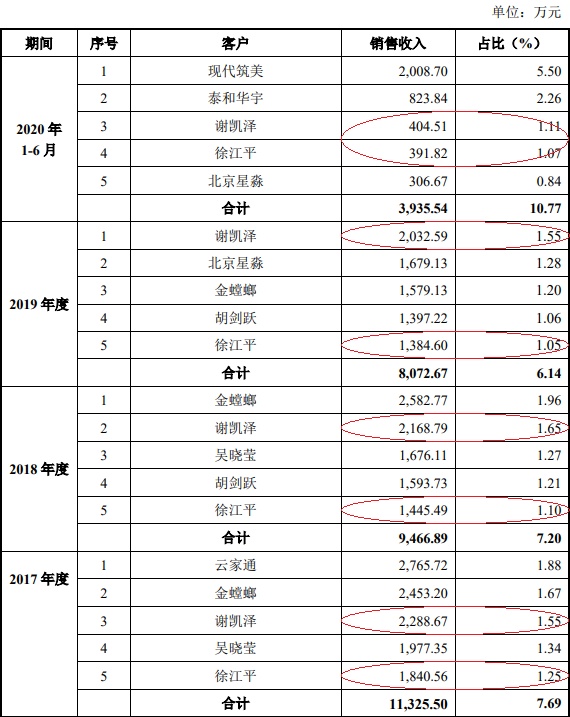 2017年至2020年1-6月,梦天家居对谢凯泽销售金额分别为2288.67万元、2168.79万元、2032.59万元、404.51万元,梦天家居对徐江平销售金额分别为1840.56万元、1445.49万元、1384.60万元、391.82万元。