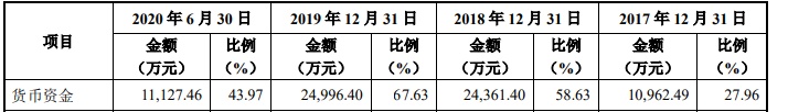 2017年至2020年1-6月,梦天家居货币资金分别为1.10亿元、2.44亿元、2.50亿元、1.11亿元,占流动资产比例分别为27.96%、58.63%、67.63%、43.97%。