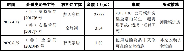 2017年,梦天家居存在两起环保行政处罚事项及三起安全生产行政处罚事项。其中,2017年4月28日,梦天家居收到处罚决定书(善)安监管罚[2017]6号、7号,因2017年1月8日公司锅炉房集尘塔内发生一起坍塌事故,造成一名员工死亡,梦天家居被罚28.00万元,余静渊被罚3.54万元,经整改,公司拆除锅炉房。