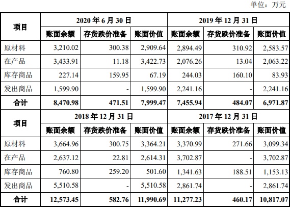 2017年至2020年1-6月,梦天家居存货账面余额分别为1.13亿元、1.26亿元、7455.94万元、8470.98万元,存货跌价准备分别为460.17万元、582.76万元、484.07万元、471.51万元。