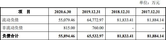 2017年至2020年1-6月,梦天家居负债合计分别为8.19亿元、8.18亿元、6.55亿元、5.59亿元;其中,流动负债分别为8.19亿元、8.18亿元、6.48亿元、5.51亿元,2019年、2020年1-6月,非流动负债分别为760.00万元、815.00万元。