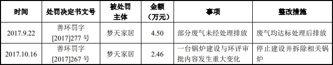2017年9月22日,梦天家居收到处罚决定书善环罚字[2017]277号,因部分废气未经处理排放,罚款金额4.50万元,经整改,公司废气均达标处理后排放;2017年10月16日,梦天家居收到处罚决定书善环罚字[2017]267号,因一台锅炉建设与环评审批内容发生重大变化,罚款金额2.46万元,经整改,公司停止建设并拆除相关锅炉。