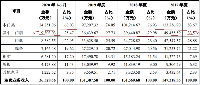 2017年至2020年1-6月,梦天家居门扇收入占比分别为33.57%、29.98%、27.73%、25.47%,为公司主要产品之一。
