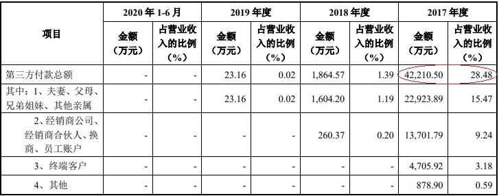 梦天家居招股书显示,由于经销商销售模式的特性,公司的下游经销商客户以个体工商户居多。2017年度、2018年度,经销商存在以配偶、亲属、员工或者直接由终端客户将货款打给公司等情形。