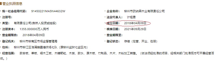 梦天家居另一板材类原材料供应商柳州市欧纳森木业有限责任公司于2018年4月成立,为公司2019年板材类原材料第三大供应商。成立次年,梦天家居向其采购板材类原材料金额为1164.75万元,2020年上半年,该公司未出现在梦天家居板材类原材料前五名供应商名单中。