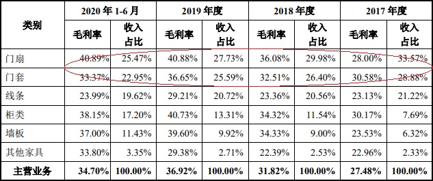 2017年至2020年1-6月,梦天家居主营业务毛利率分别为27.48%、31.82%、36.92%、34.70%;其中,门扇产品毛利率分别为28.00%、36.08%、40.88%、40.89%,门套产品毛利率分别为30.58%、32.51%、36.65%、33.37%。