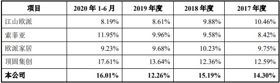 梦天家居销售费用率2017年、2018年行业最高,2019年、2020年1-6月仅次于最高的顶固集创。2017年至2020年1-6月,顶固集创销售费用率分别为12.59%、12.36%、13.64%、17.61%。