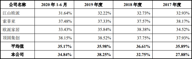 2017年至2020年1-6月,梦天家居综合毛利率分别为27.88%、32.75%、38.25%、34.84%,同行业上市公司的综合毛利率平均值分别为35.89%、36.61%、35.98%、35.17%。