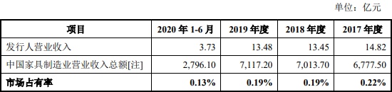 2017年至2020年1-6月,梦天家居营业收入占中国家具制造业的营业收入总额的比例分别为0.22%、0.19%、0.19%、0.13%。