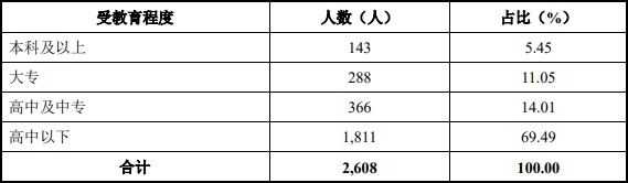 截至2020年6月末,梦天家居员工中本科及以上学历共143人,大专学历共288人,高中及中专学历共366人,高中以下学历共1811人。
