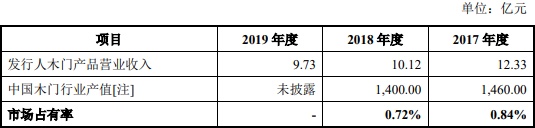 其中,2017年、2018年,梦天家居木门产品营业收入占中国木门行业产值的比例分别为0.84%、0.72%,排名行业前三。