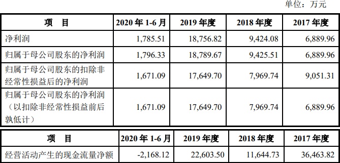 2017年至2020年1-6月,梦天家居归属于母公司股东的净利润分别为6889.96万元、9425.51万元、1.88亿元、1796.33万元;经营活动产生的现金流量净额分别为3.65亿元、1.16亿元、2.26亿元、-2168.12万元。2018年、2019年,梦天家居归属于母公司股东的净利润增速分别为36.80%、99.35%。