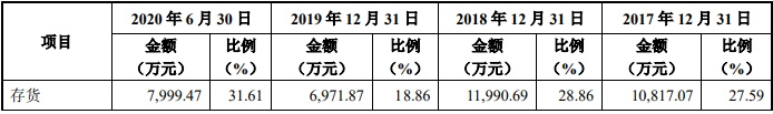 2017年至2020年1-6月,梦天家居存货账面价值分别为1.08亿元、1.20亿元、6971.87万元、7999.47万元,占流动资产比例分别为27.59%、28.86%、18.86%、31.61%。