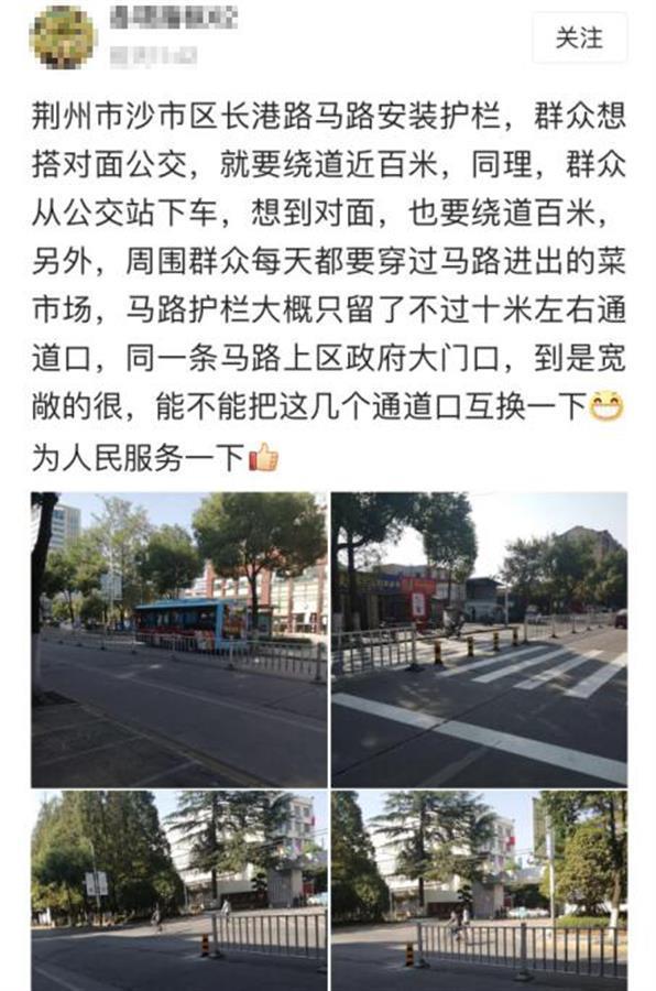 “本来马路就很窄,留出的过街通道还这么少,这护栏不是添堵吗?”近日,家住湖北荆州市沙市区洪垸小区的市民秦先生向极目新闻记者反映:狭窄的长港路安装护栏后,留给行人过街的通道太少,市民要想去马路对面,要绕行近600米。