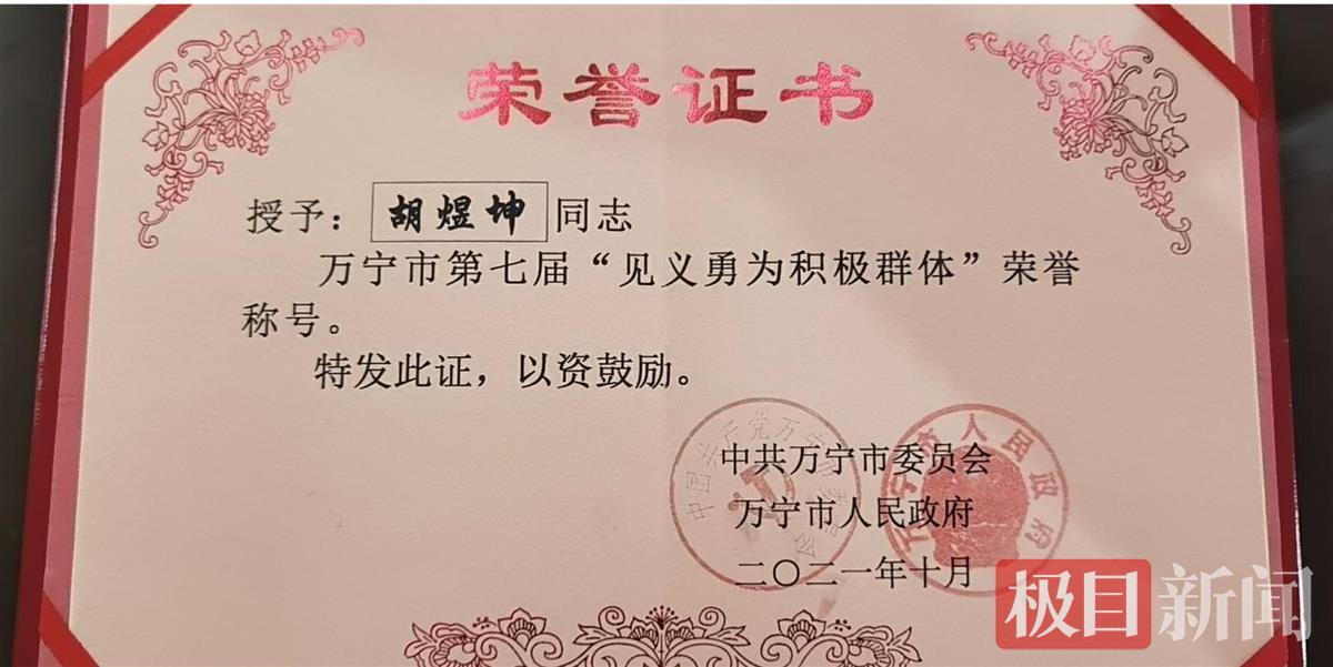 事发后,获救者家属也来到万宁市,为胡煜坤申请见义勇为荣誉称号,万宁市委政法委第一时间开展相关评定工作。今年10月11日,万宁市委政法委、万宁市见义勇为工作协会联合公布拟授予万宁市2021年度见义勇为积极分子(群体)人选名单及事迹,并向社会公示。救人牺牲的武汉小伙胡煜坤及其他三位救援人员出现在名单中。