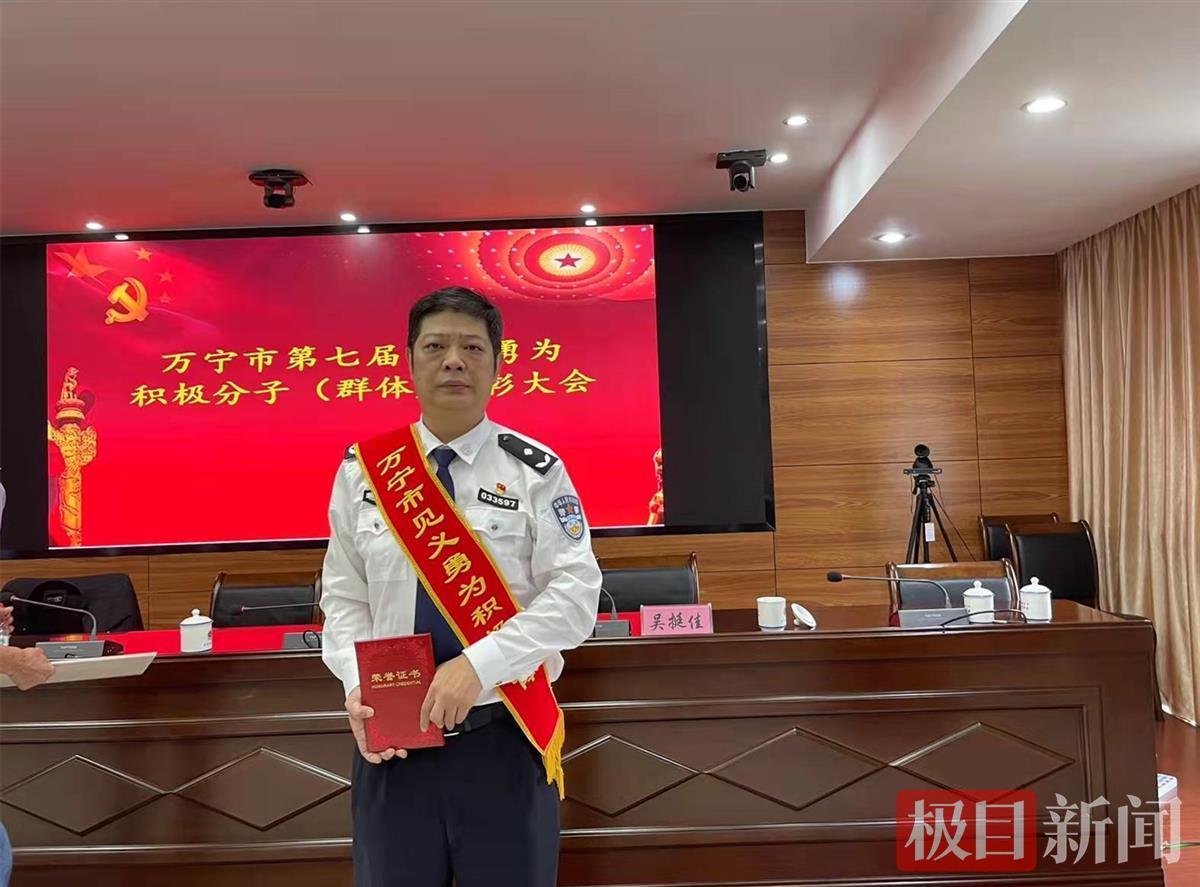 今年6月13日下午,武汉小伙胡煜坤和女友在海南省万宁市日月湾游玩,下午4时许海水突然涨潮,两名小孩被浪潮卷入海中。听到呼救声,胡煜坤两次冲入海中救人,小孩获救上岸,可胡煜坤却再也没有回来(此前报道)。10月27日上午,万宁市委、市政府授予胡煜坤等人“见义勇为”荣誉称号,来自武汉青山的警察父亲代其领奖。