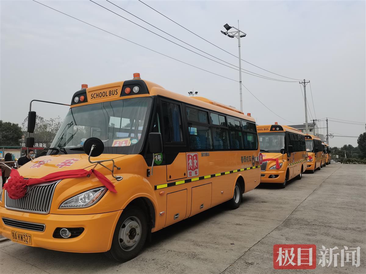 10月27日上午10点,武汉江夏区山坡街举行校车运营启动仪式。5台大鼻子校车披挂红绸,驶于152名幼儿园幼儿和小学生的家校之间。