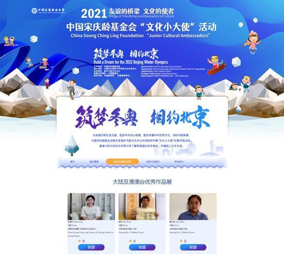 为加强文明交流互鉴、促进中外民心相通,更好传播中华优秀文化、讲好中国故事,中国宋庆龄基金会联合海外中国文化中心及相关合作机构共同举办“文化小大使”评选活动,邀请中外青少年以线上方式开展文化交流。2021年度活动主题为“筑梦冬奥、相约北京”,共收到来自32个国家的209名青少年的优秀作品。活动将在北京冬奥会倒计时100天时开始进行网络投票和专家评审环节,评出的“文化小大使”将有机会参与一系列丰富多彩的中外青少年人文交流活动。