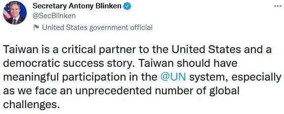 布林肯发推称“支持台湾有意义参与联合国体系”。图源:推特