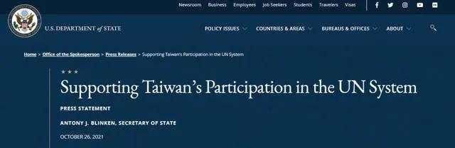 10月26日,美国国务卿布林肯发表声明,称“支持台湾积极、有意义地参与联合国体系”。