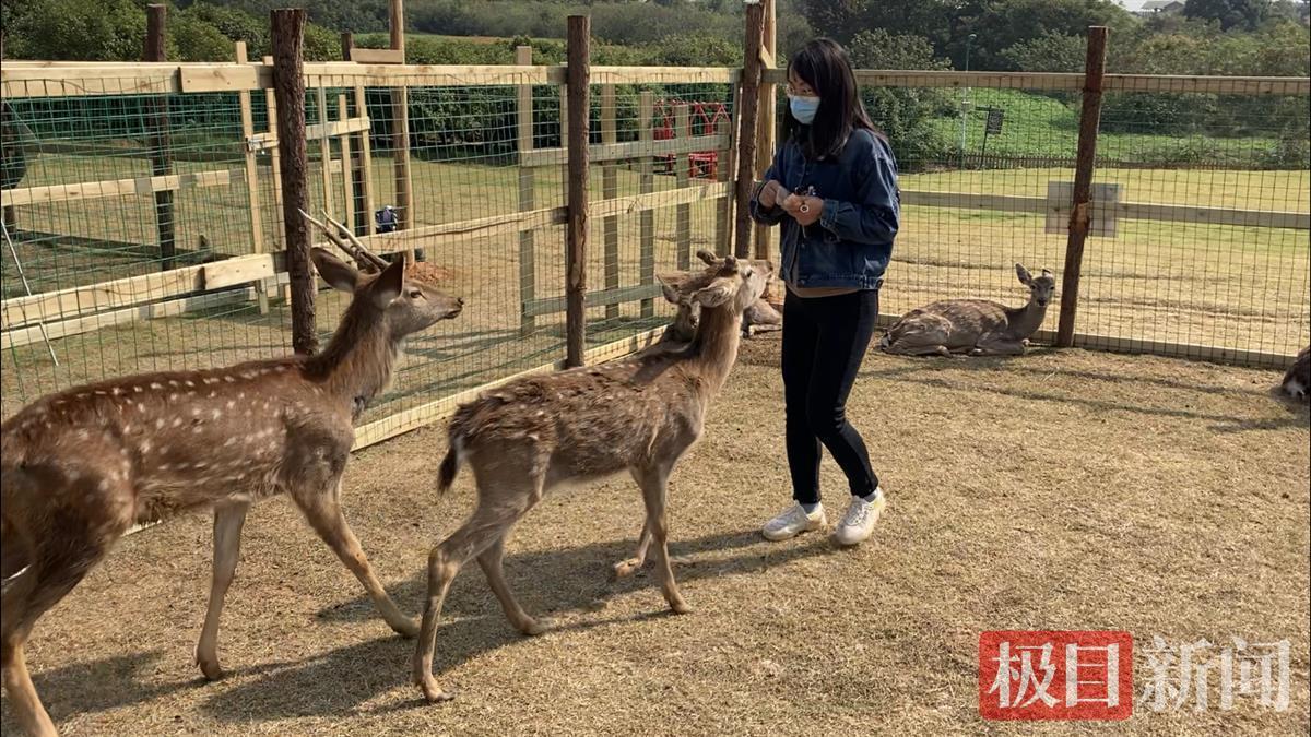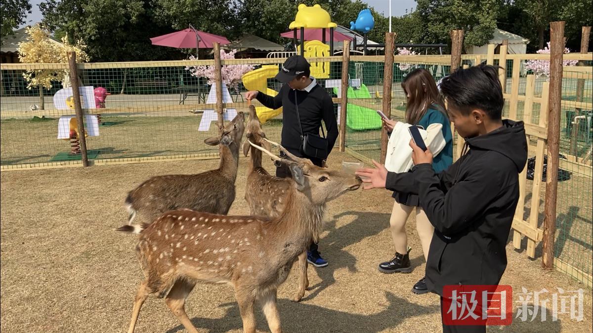 10月27日,极目新闻记者进入鹿岛公园内,在现场看到,一块草地上,树立着一人高的围栏,梅花鹿群圈养在内,打盹的打盹,吃草的吃草,好不快活。它们发现有人靠近,立即跳了起来,凑到眼前,高高地抬起脖子,仿佛索食的萌娃。一对游人一进入园内,立即被四头梅花鹿围在中央。游人不仅可以零距离抚摸梅花鹿,还可以走进围栏之中,与它们拥抱、合影,投喂胡萝卜,享受被梅花鹿群簇拥的快乐。