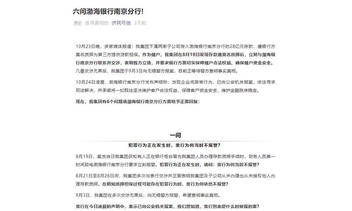 同日,济民可信集团官方微信发布《六问渤海银行南京分行》一文,就集团共28亿存款被莫名质押为第三方提供贷款担保一事,提出六个疑问,并请渤海银行南京分行给予正面回复。