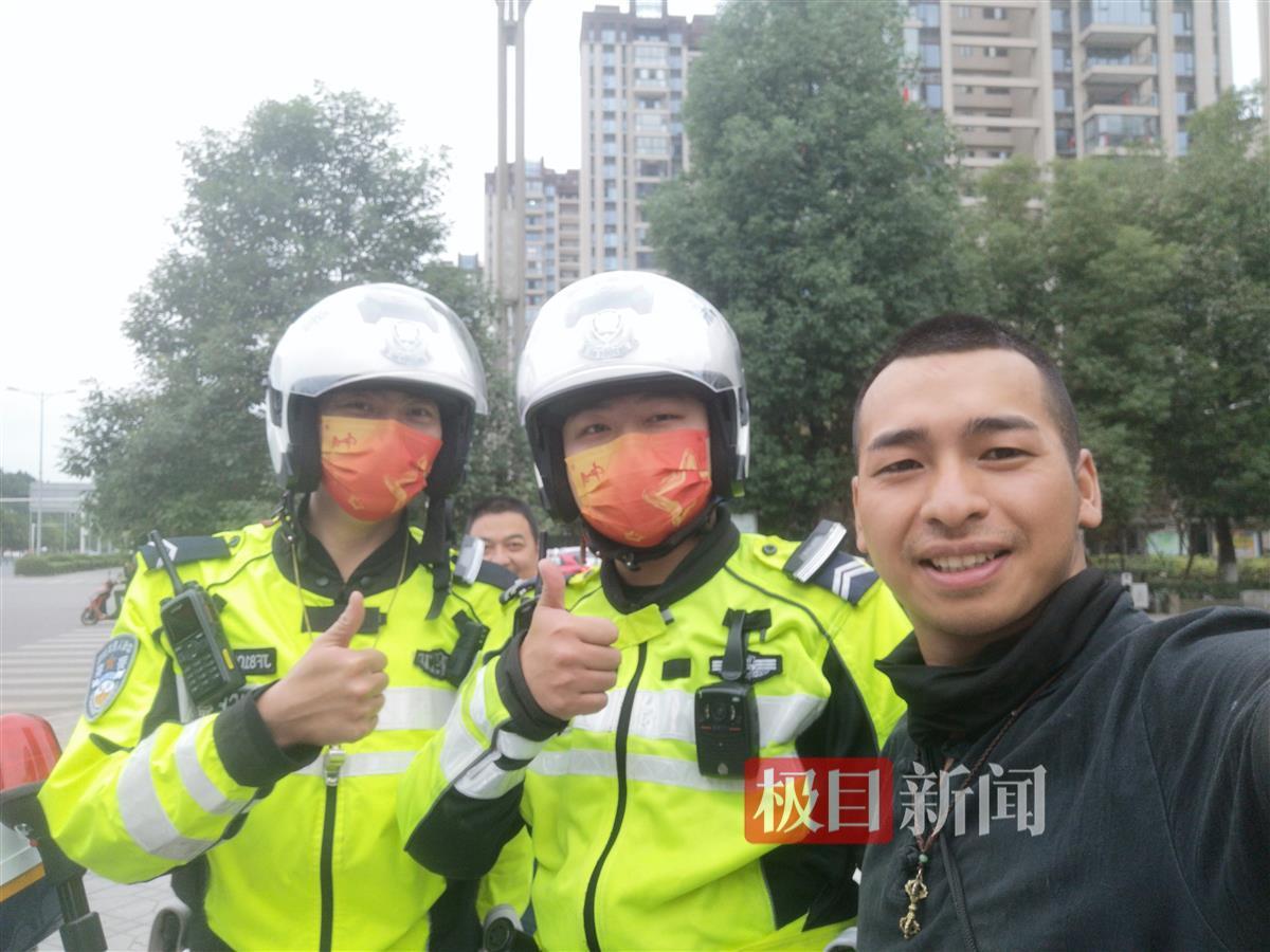曾行告知原委之后,江油交警用铁骑一路护送他和马出城。临别之前,曾行和交警还合影留念。