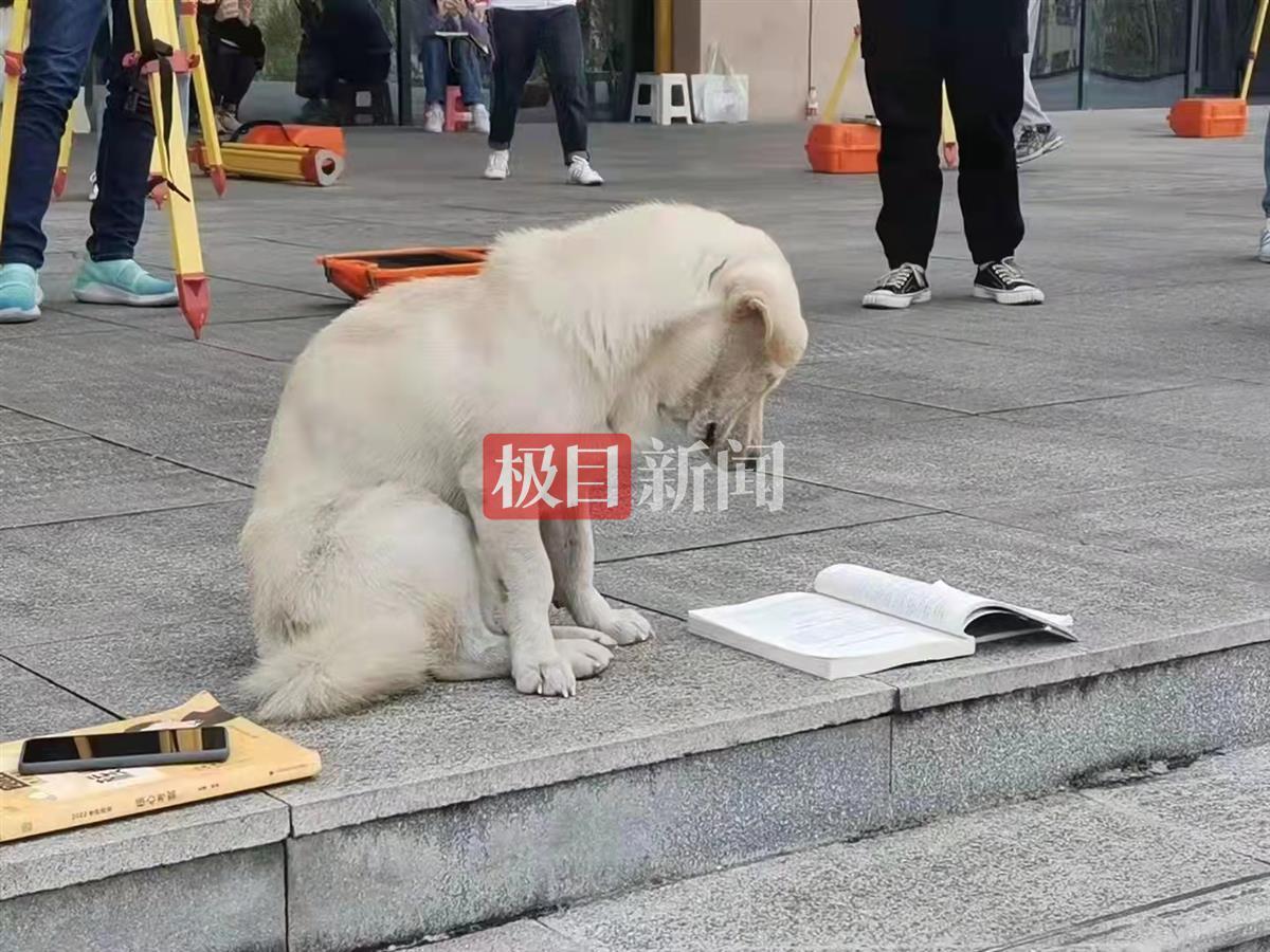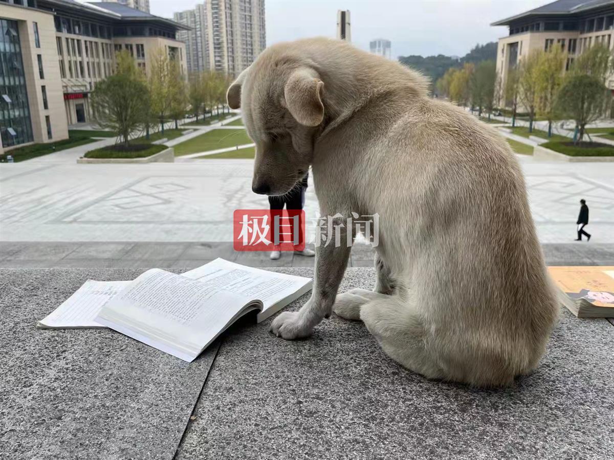 只见图片和视频中,一条白黄色的小狗正端坐在图书馆前的广场上,前方是一本翻开的书本,这条小狗一动不动地盯着书本,放大图片,书本中写着“第三章欧阳修及其影响下的诗文创作”,书上还有书本主人做笔记的痕迹。小狗的身旁是另一本书和一个水杯。还有一排学生坐在台阶上看书。路过的学生把这一幕拍照记录下来,“我觉得这个很有意思,小狗都在看书学习。”该校学生王同学说。