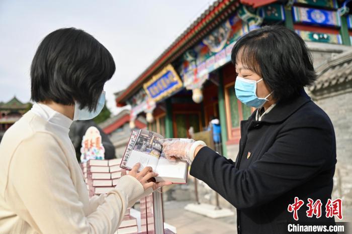 28日,北京颐和园发布《颐和园日历·2022(福寿文化)》,图为工作人员为读者讲解日历内容。 中新社记者 张兴龙 摄