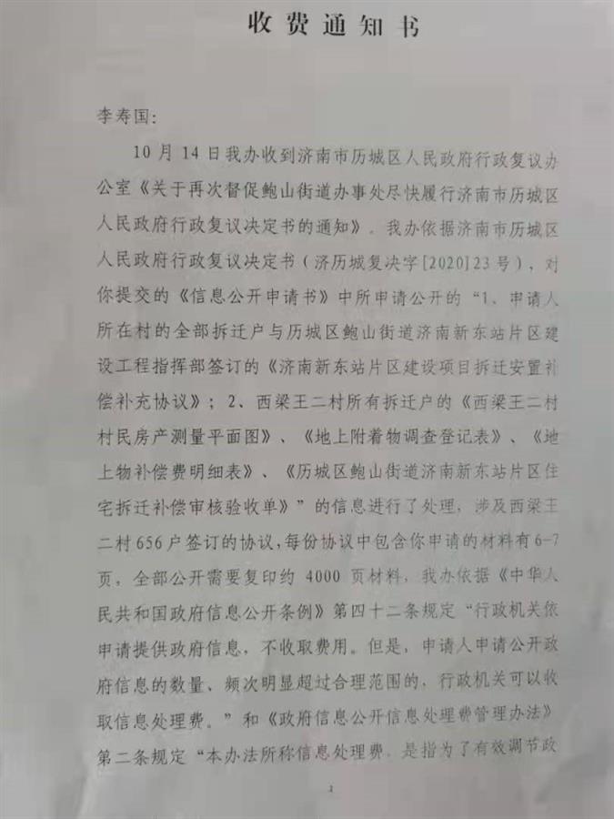 历城区政府认定,李寿国所申请的信息属于政府公开范围,但鲍山街却回应李寿国称,他需要打印相关的4000页公开信息材料,需要支付154700元。
