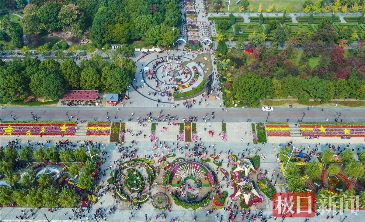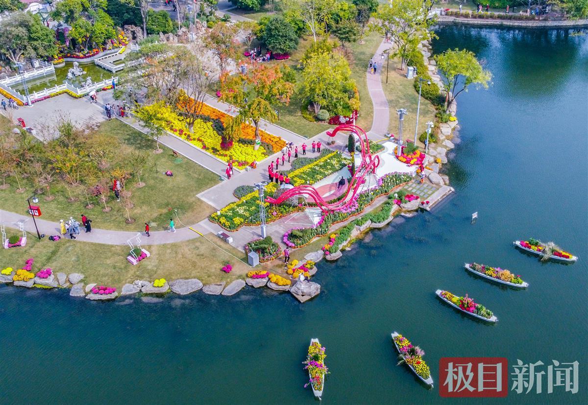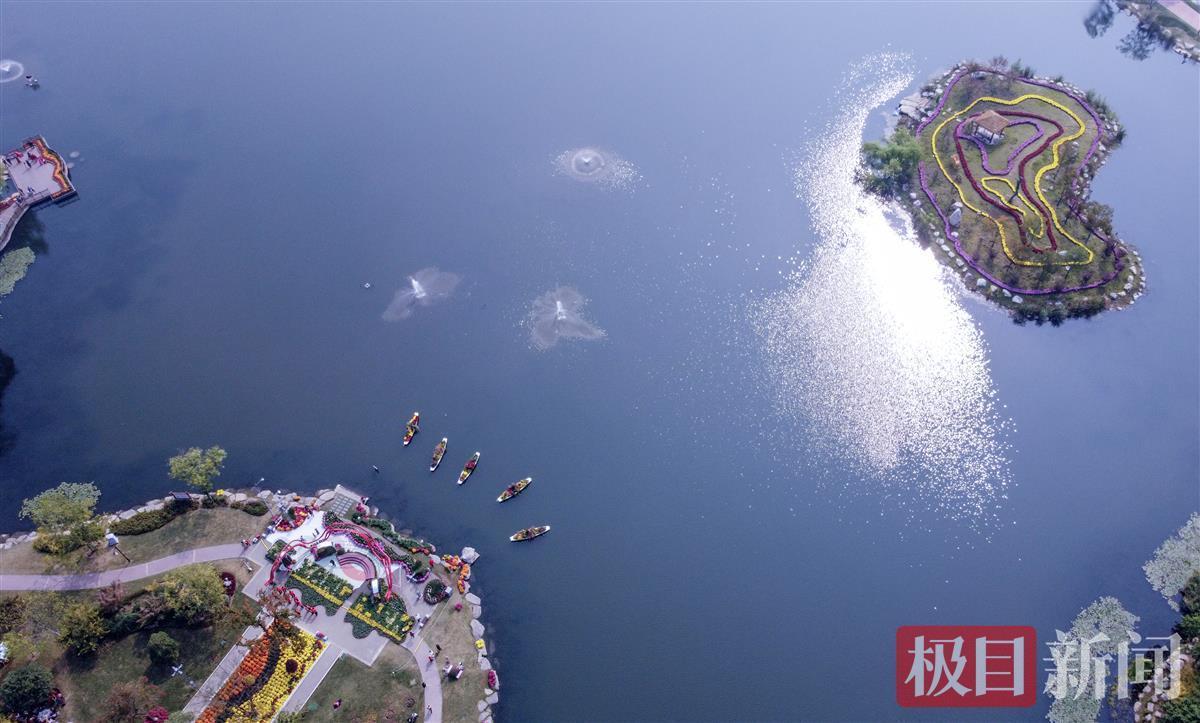 移步武昌紫阳湖畔,湖边由一盆盆“满天星”菊花镶边,红黄相映,夺目耀眼,湖中漂着一艘艘花船,一条条彩色花带点亮湖心岛。空中俯瞰,菊花给紫阳湖公园上了自然彩妆。