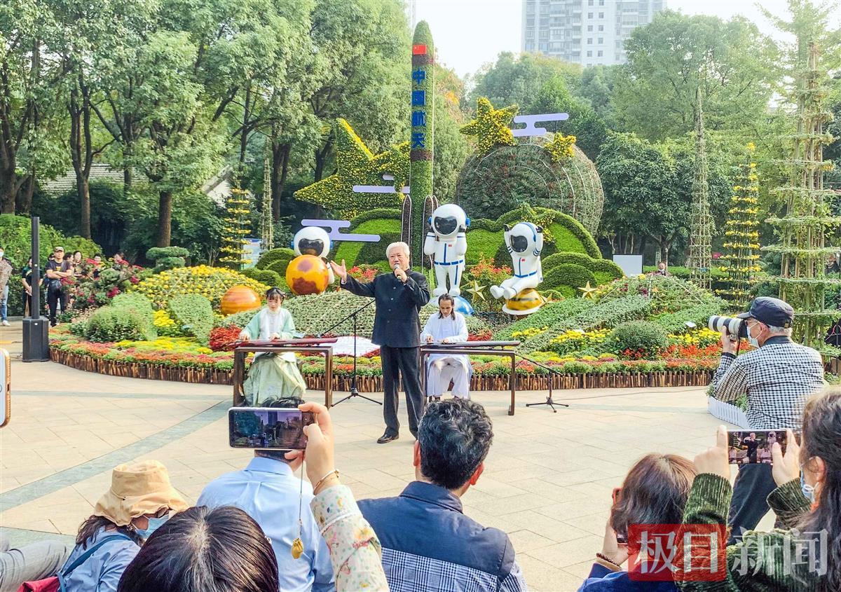 喷泉欢跃,桂香浮动,约12万盆600余种菊花在此一展芳华,“中国航天”的扎景气势磅礴,还有或粉或紫三角梅一旁添彩。
