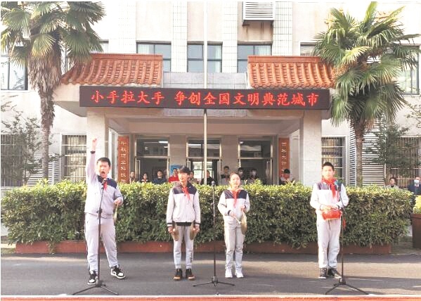 “校园环境要美化,保洁工作靠大家,一见垃圾能捡起,顶呱呱……”10月25日,一场“小手拉大手,争创全国文明典范城市”主题活动在武汉市第45中学举行,学生创作表演三句半,家长开讲文明礼仪小课堂,倡导全校师生共建文明班级、文明校园。
