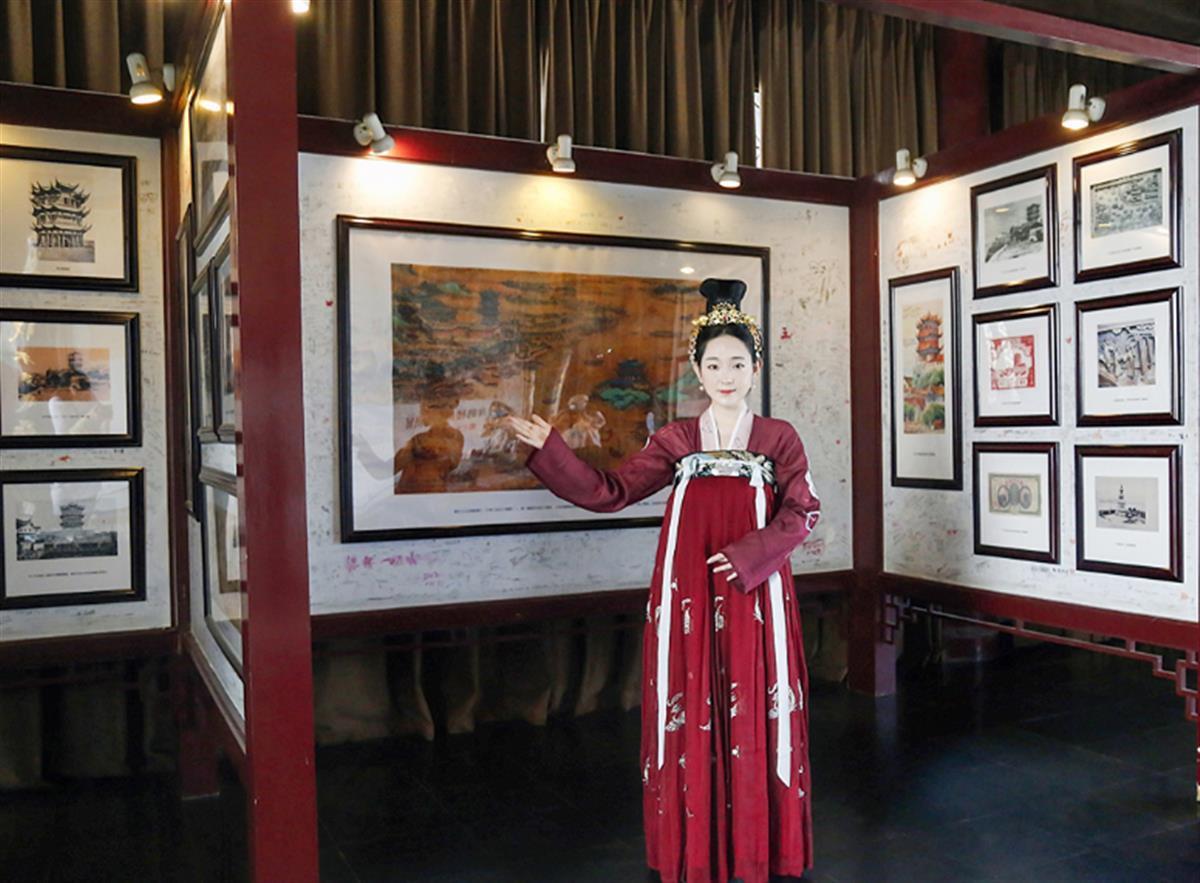 每周一三五上午10:30,黄鹤楼主楼内,讲解员们会以一场优美的舞蹈开场,《江天浩瀚》壁画前,衣袂飘飘,鼓声阵阵,空灵清远,游人们能有更深的文化体验。在白云阁,除了身穿唐装汉服的讲解员,节假日还能见到不同时期的汉服特色讲解。从装扮服饰到礼仪神态,一步一景,一步一人,才过盛唐,又到明清,她们将汉服之美、特色解说、诗词文化融汇一体。