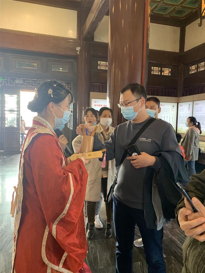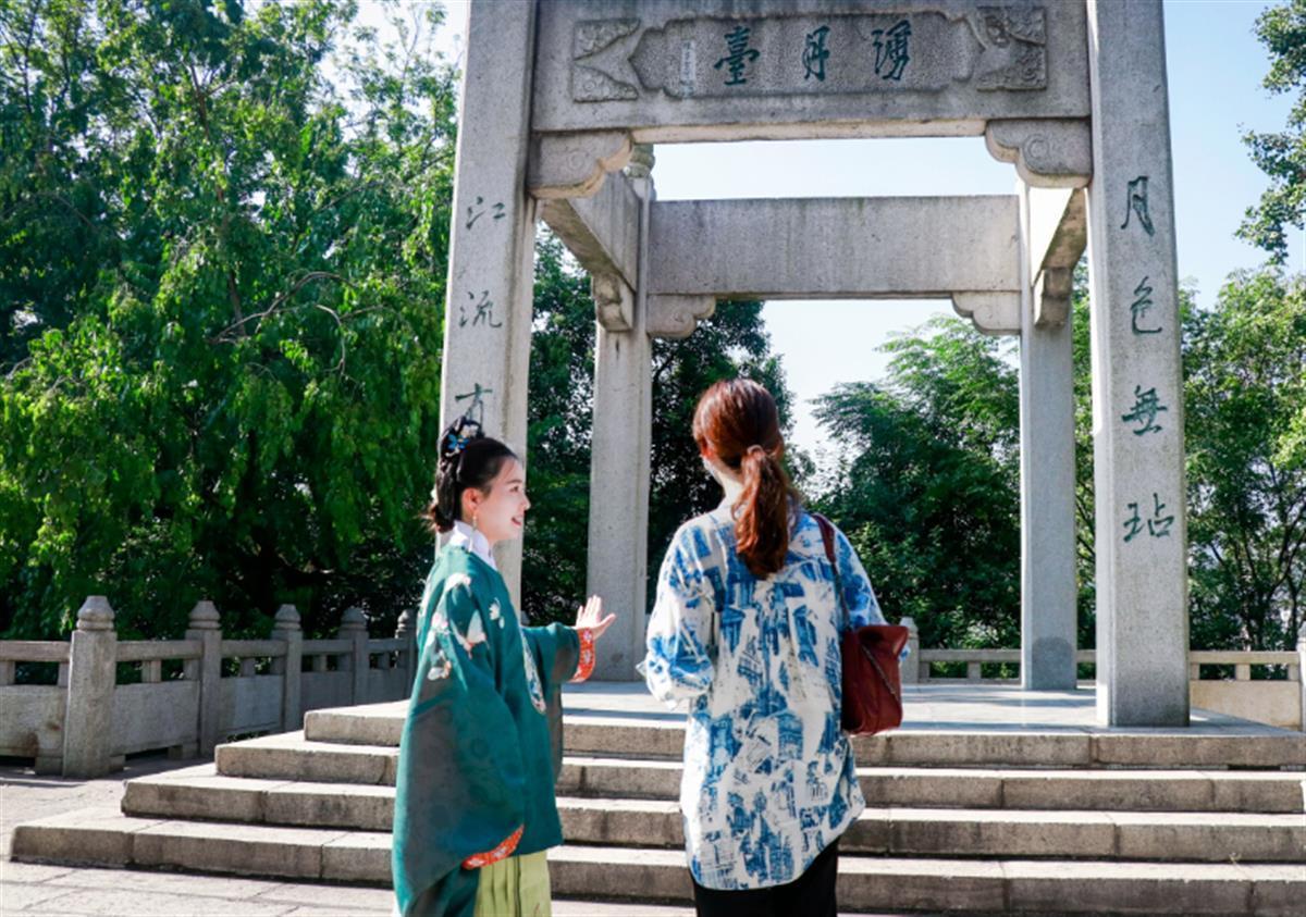如何让历史可触摸,让文化可感知。今年4月底,黄鹤楼公园推出特色讲解互动活动,不少经过专业培训的工作人员学习古韵身法、身着各色“汉服”,与美景相应、与文化相融,让游客体验沉浸式游园。着一袭华服,环佩琳琅,在山水楼阁之间,黄鹤楼公园的讲解员们开启了忙碌的一天,让游人赴一场现代与古韵的互动。