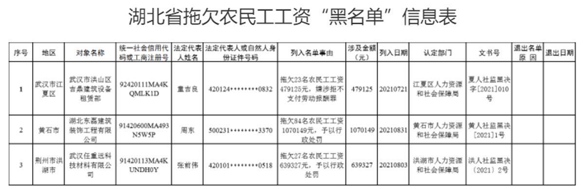 10月29日,极目新闻记者从湖北省人社厅获悉,湖北省持续开展重大劳动保障违法行为社会公布工作和拖欠农民工工资“黑名单”管理工作,强化劳动保障监察执法,加大对严重违法行为的打击力度。经调查,2021年第三批重大劳动保障违法行为及拖欠农民工工资“黑名单”信息现对外公布。极目新闻记者梳理发现,在公布的10起案例中,8起为拖欠劳动报酬案,涉及金额最少的16.429万元,最多为237.1612万元。