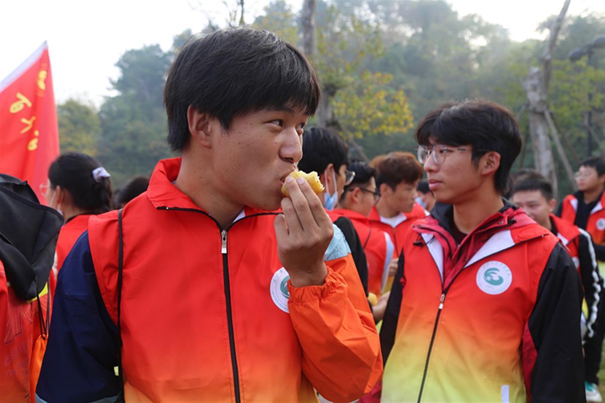 时间一点点过去,行程已然接近尾声,黎明的曙光逐渐照亮大地,29日早上7点15分,队伍行至武汉市江夏区花山,虽然困倦和腿部酸痛席卷全身,但是拉着红歌的队伍依旧精神昂扬,向着花山山顶进发。登顶花山之后,队员们尝到了补给品——“冻土豆”,“当年革命先辈在抗美援朝战场上吃不饱穿不暖,他们用牺牲与奉献换来了我们今天的美好生活,今天我们吃冻土豆,更是提醒、激励我们自己要忆苦思甜。”来自21级土木工程专业的周庭锋哽咽说。