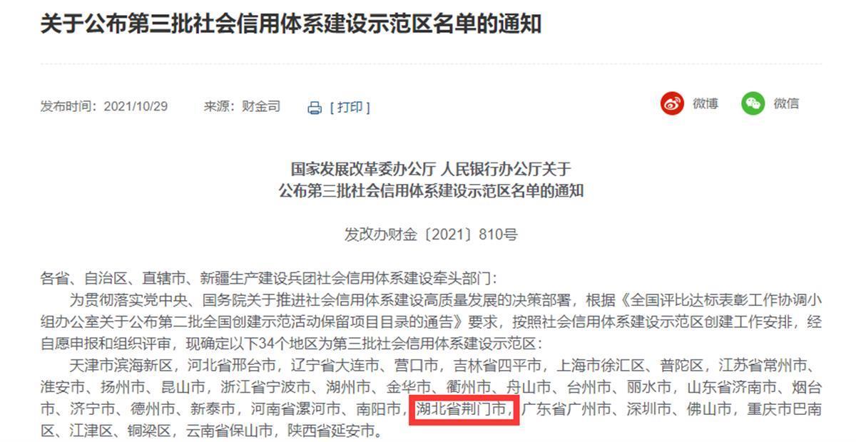 10月29日,国家发改委和中国人民银行联合发布第三批社会信用体系建设示范区名单,全国共34个地区入选,其中包含湖北省荆门市。