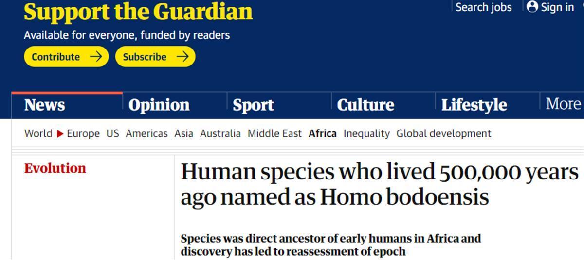 据英国《卫报》报道,近日,一项发表在《进化人类学》期刊上的研究结果表明,一种新发现的人类祖先物种被研究人员用“Homo bodoensis”来命名。