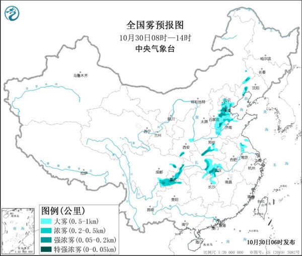 10月30日早晨至上午,辽宁西部、北京东南部、天津、河北东部和中南部、山东西北部、河南北部和南部、江苏中部、湖北中部、湖南北部、四川盆地东南部等地的部分地区有大雾,其中辽宁西部、天津西南部、河北东南部、山东西北部、河南南部、湖北中部、四川盆地东南部等地局部有能见度不足200米的强浓雾。