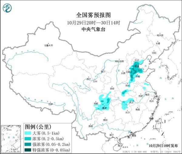 10月29日夜间至30日上午,北京东南部、天津、河北东部和中南部、山东西北部、河南北部和南部、江苏北部、湖北中部、湖南北部、四川盆地等地的部分地区有大雾,其中天津西南部、河北东南部、山东西北部、四川盆地等地局部有能见度不足200米的强浓雾。