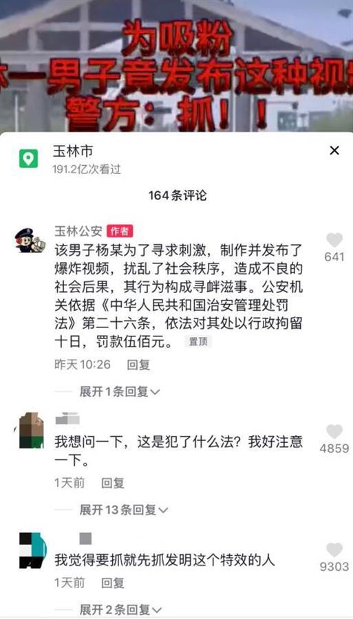 极目新闻记者注意到,在玉林市公安局发布的这条通告中,有网友留言表示疑惑,称“这是犯了什么法?我好注意一下”“应该抓设计这个特效的人”“麻烦科普一下,发个炸地球的特效抓不抓”。