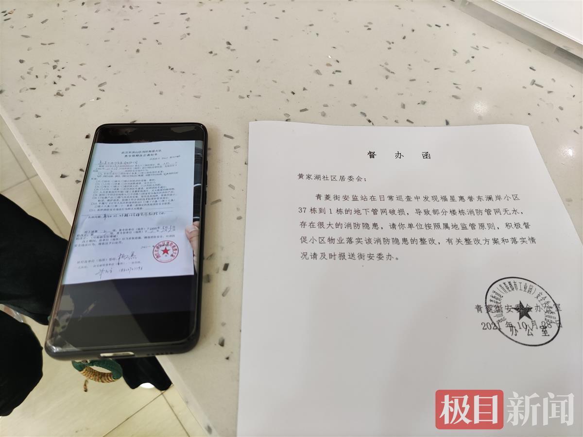 原来,该小区的由于地基下陷导致了地下管网破损,水流失严重,“物业公司暂时将地下管网的水闸关闭了,所以消防栓这才不出水。”马丽君告诉极目新闻记者,此前物业和业委会准备动用维修基金来修复地下管网,但是由于业委会正在处于换届阶段,走流程时间较长,“现在物业公司准备向总公司申请,先拿出钱来对地下管网进行维修。”马丽君拿出了此前消防部门对物业下达的整个通知书,记者在该通知书上看到,具体问题写明小区的34、35、36等楼栋消防栓无水,“我们社区也向物业下达了督办函,督促小区物业落实消防整改。”马丽君说道。