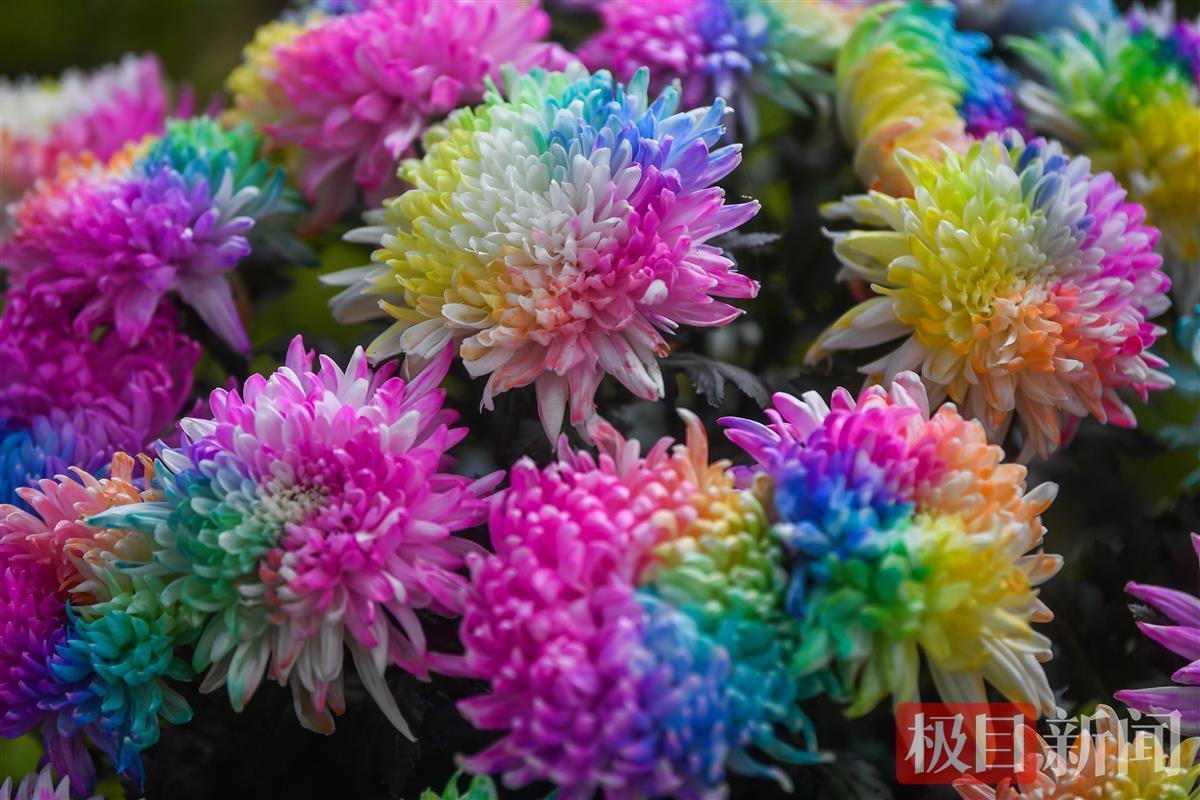 记者现场看到,每朵菊花呈现多种颜色,众彩纷呈、绚丽多姿、新颖独特,堪称菊中奇观,引得现场游客竞相观赏、拍照打卡。