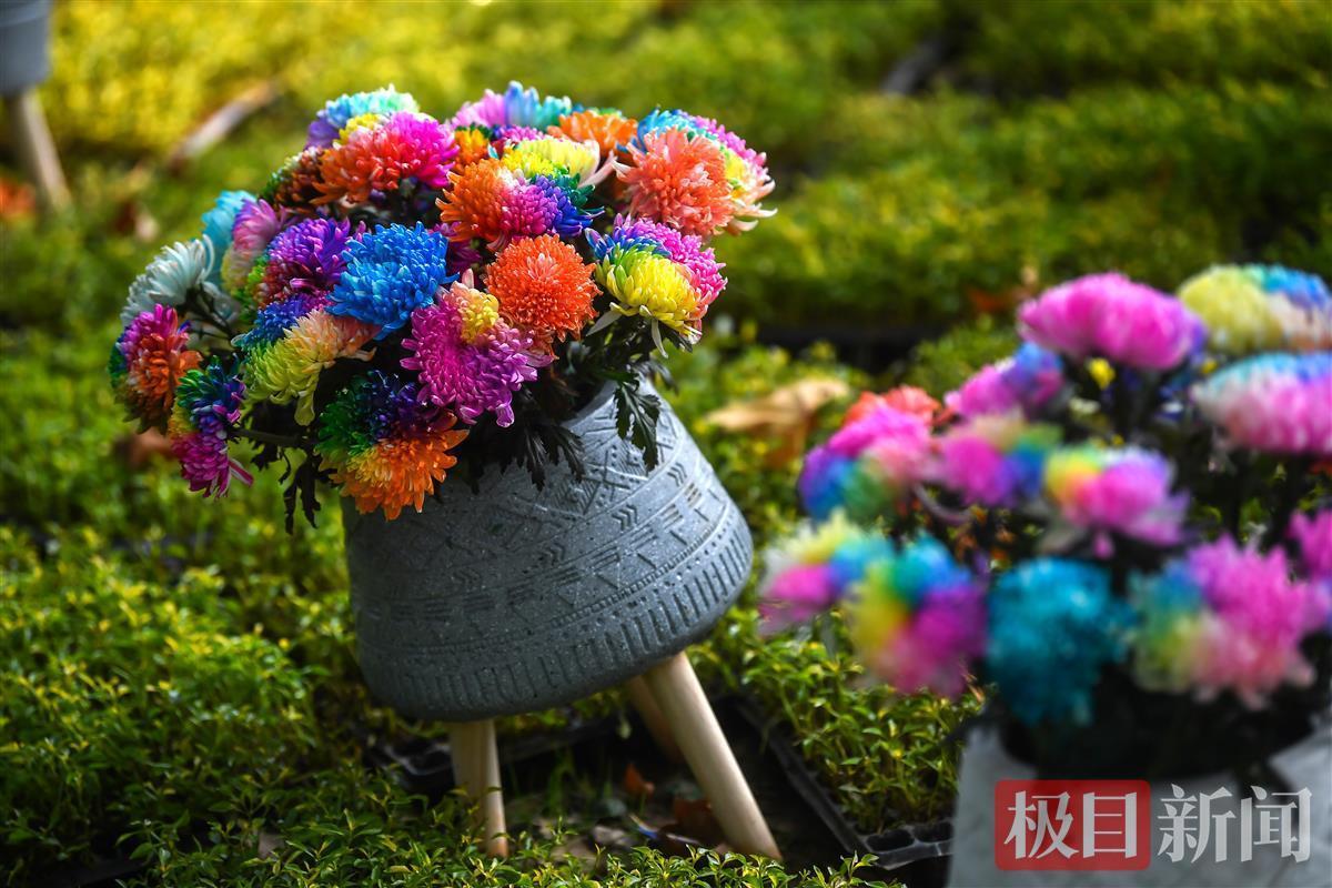 据了解,“炫彩菊”并非普通花朵染色,而是采用生物炫彩素,通过控制温度,水分,光照,PH等因素,将各种光彩呈现在花瓣上,使多种色彩均匀呈现。因其寓意人生绚烂和生命蓬勃,也被称为“幸福菊”。