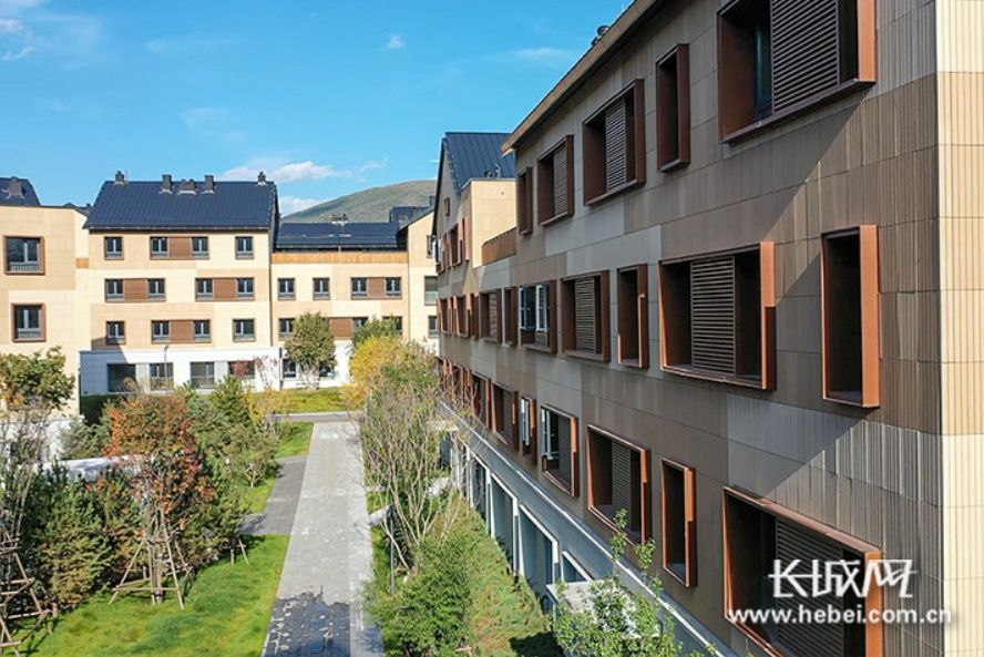 晚秋时节的崇礼,凉风阵阵,天空清澈湛蓝。沿着太子城高铁站向北走约500米,映入眼帘的是一栋栋极具浓郁北方山地民居特色的建筑:黑灰色屋顶、黄色墙体,五环标志、“BeiJing 2022”字样镶嵌其中……这一排排错落有致的公寓楼便是2022年北京冬奥会张家口赛区冬奥村。